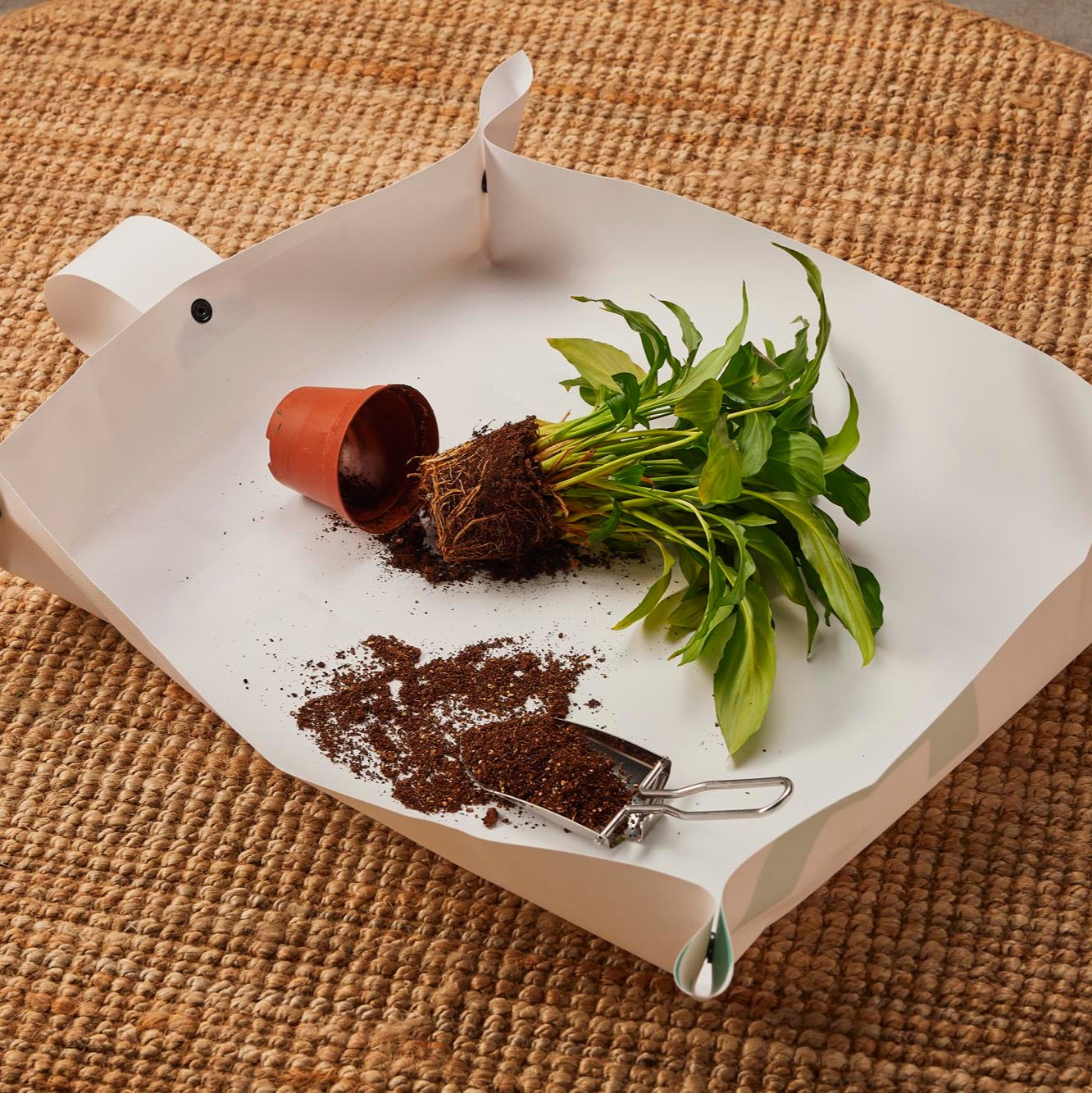 You simply unfold it and metal snap button up each corner so it creates a kind of tray shape, this stops soil from going everywhere while you are potting