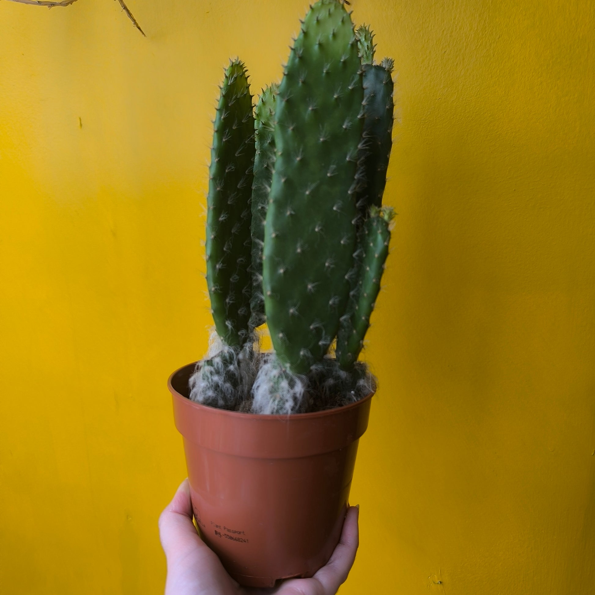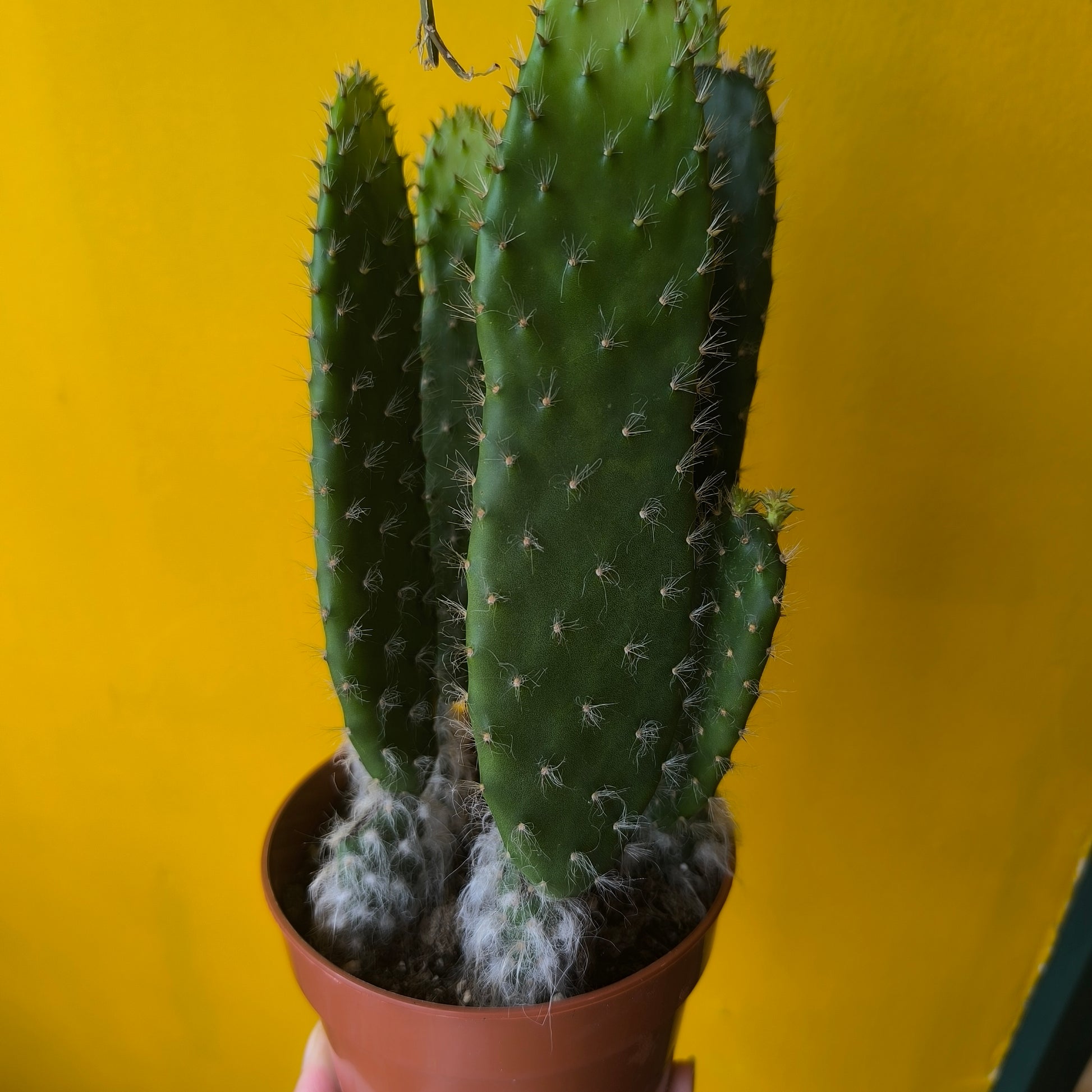 The Opuntia 'Blue Ale' is a dense shrubby tree-like cactus. The paddles are olive green-grey but fading in colour as they mature. Needle-like spines and creamy-white in colour as well as hair-like spines that can be quite long giving a tufted look.