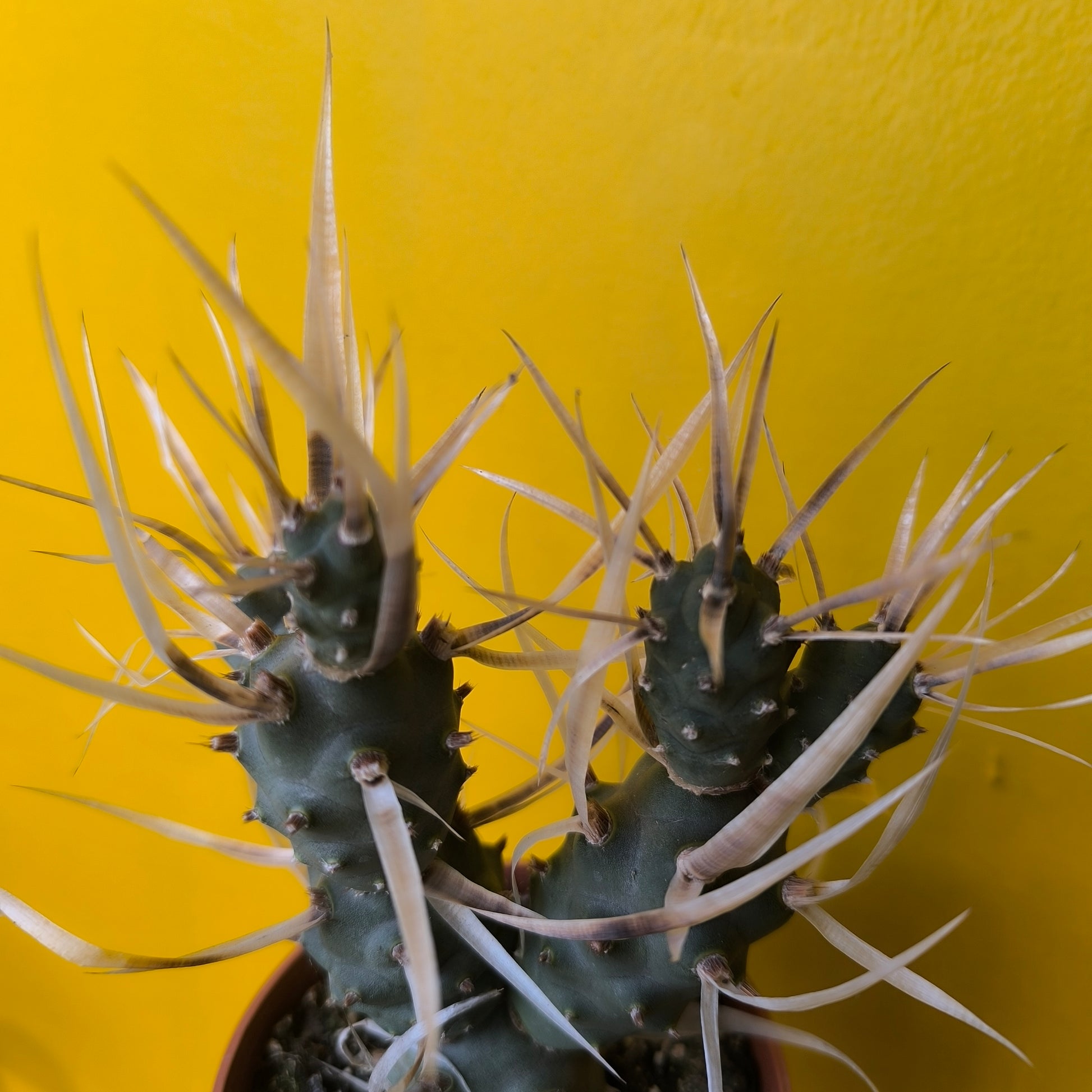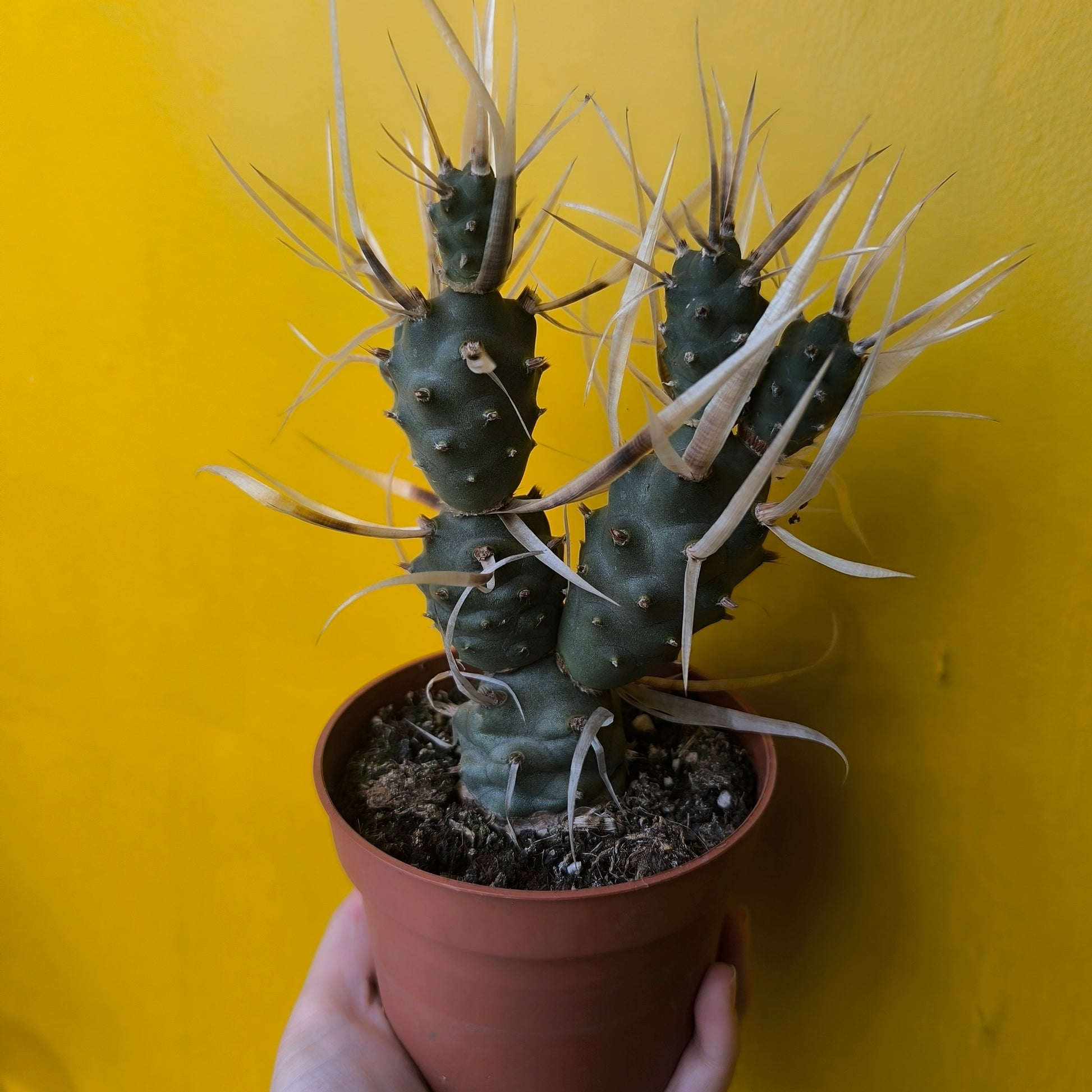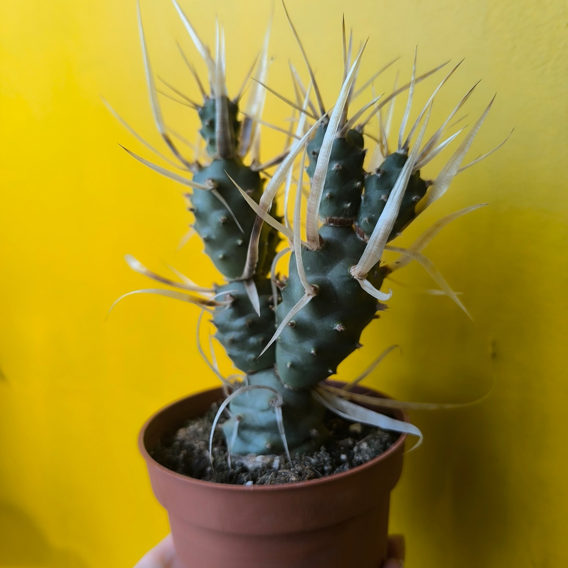 This unusual cactus Tephrocactus articulatus var. papyracanthus or the Paper Spine Cactus has these gorgeous ribbon- or paper-like spines that are not spikey. The different sections of the Paper Spine cactus also easily detach so you can create more cactus! Max height is 30cm