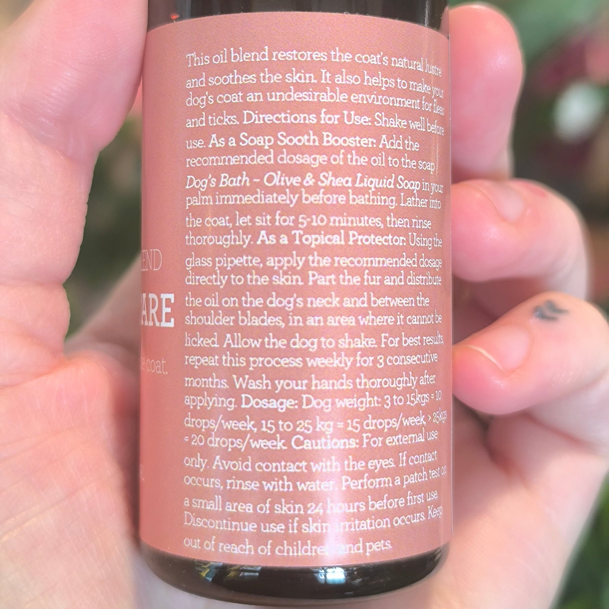 - As a Soap Sooth Booster: Add the recommended dosage of oil to the Dog’s Bath – Olive & Shea Liquid Soap in your palm before bathing. Lather into the coat, let sit for 5–10 minutes, then rinse thoroughly.