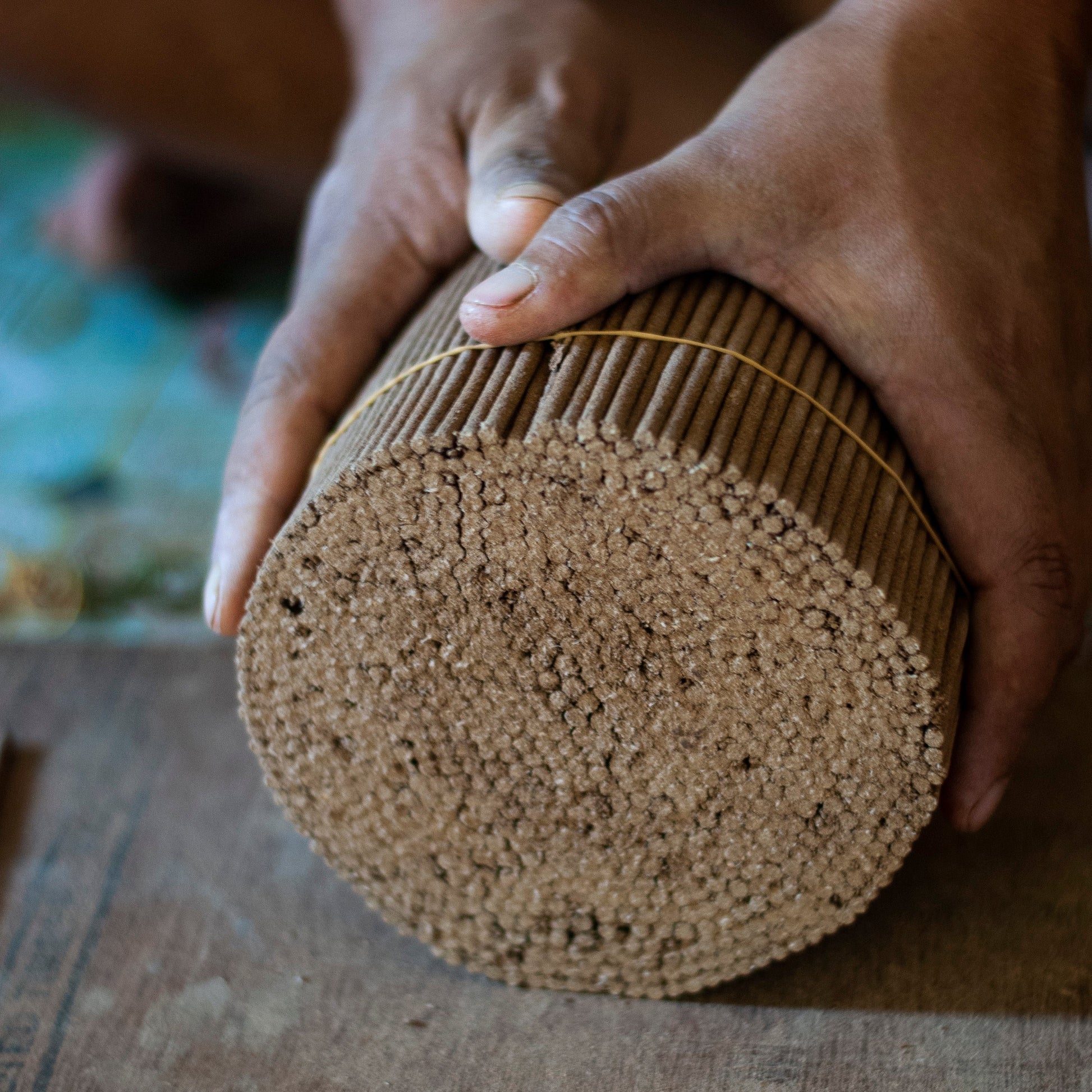 We use handmade processes as much as possible whether it is making and cutting incense or the packaging for incense (handprinted in handmade paper). We specially work on small family enterprises.