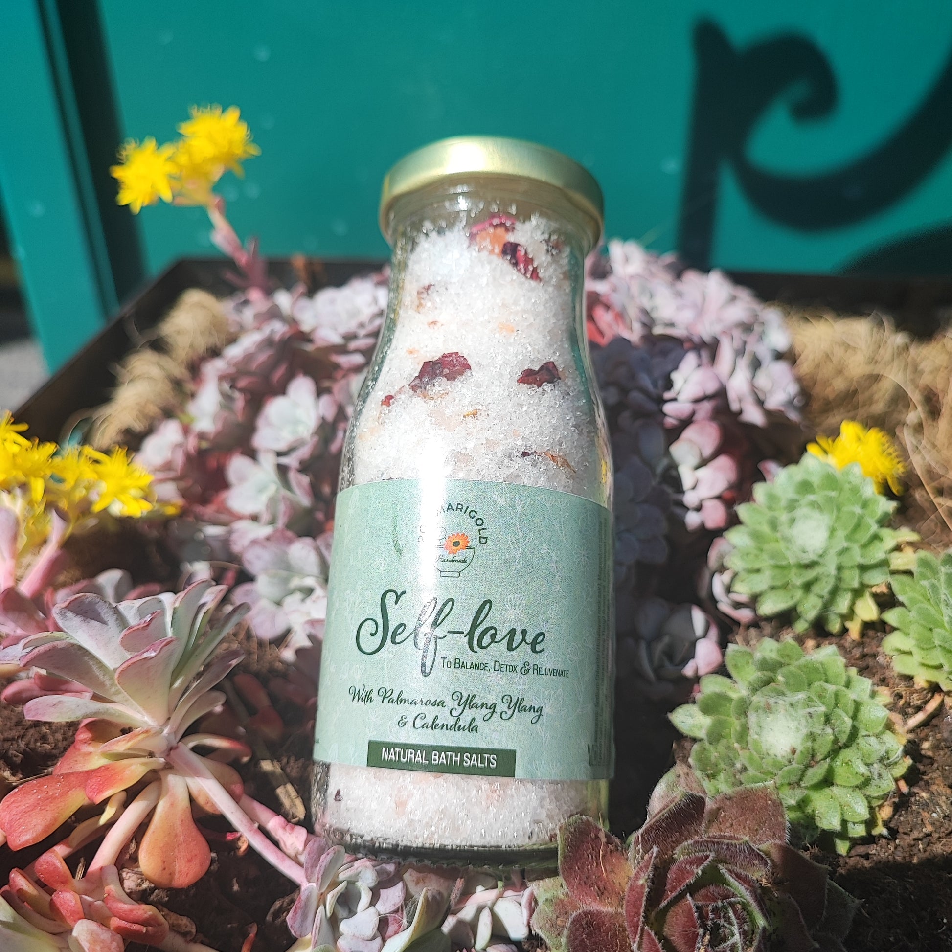 Self-love : the relaxation and bedtime soak. This soak contains ylang ylang and palma rosa oils to help you to calm and soothe your body and mind. Rose and calendula petals inside for added texture, colour and goodness. Perfect before bed, after work or if you have been feeling overwhelmed.