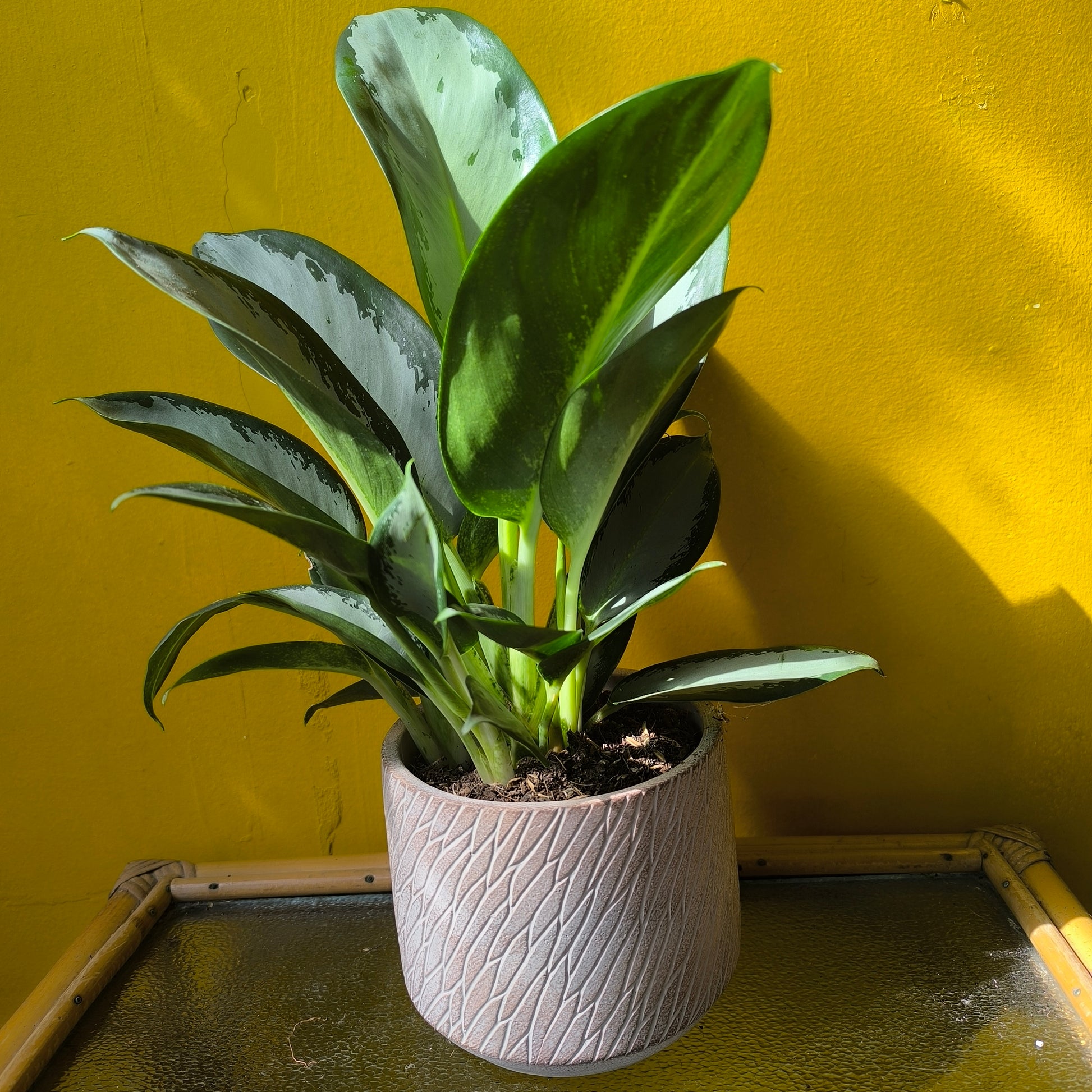 Another unusually textured pot with an etched weave-like pattern of shimmering bronze and tinges of blue-grey or a blush with maroon tints