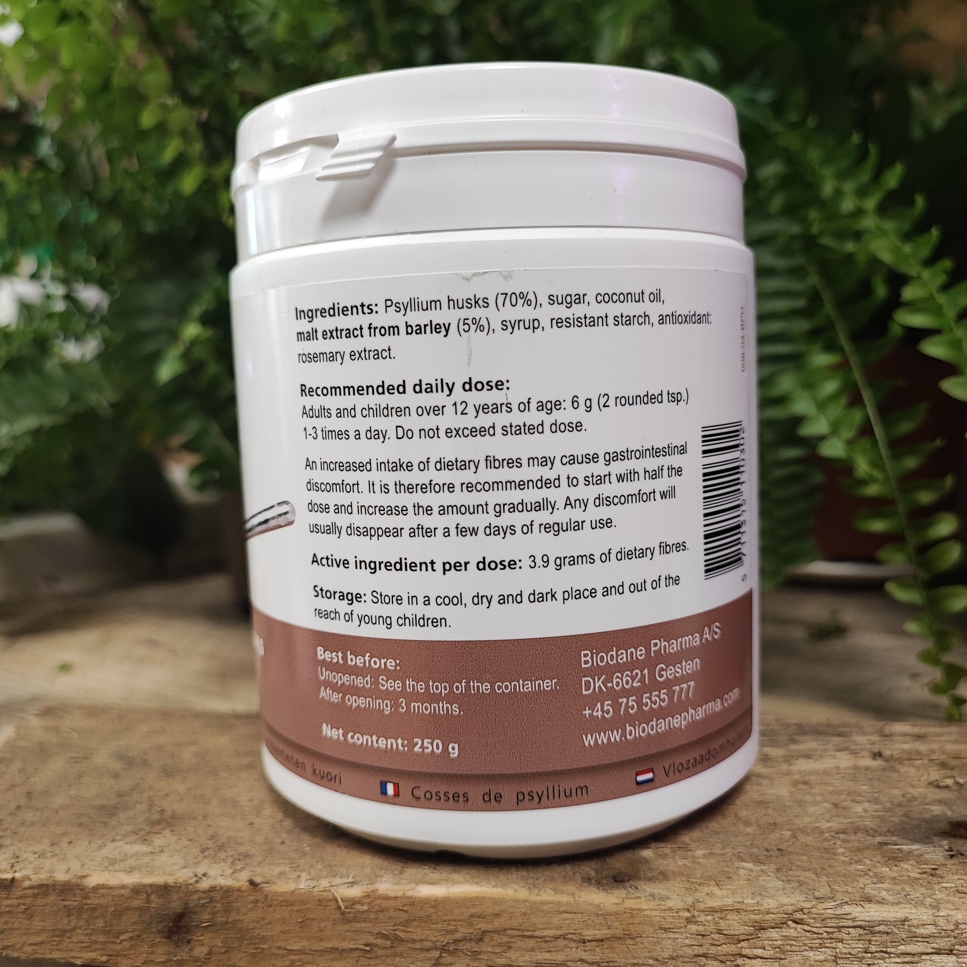 This is a completely natural product made from a plant. Something called `psyllium husk` is taken from this plant, and when we eat it and drink water, it turns into a lovely jelly mass in our intestines, moving everything along smoothly