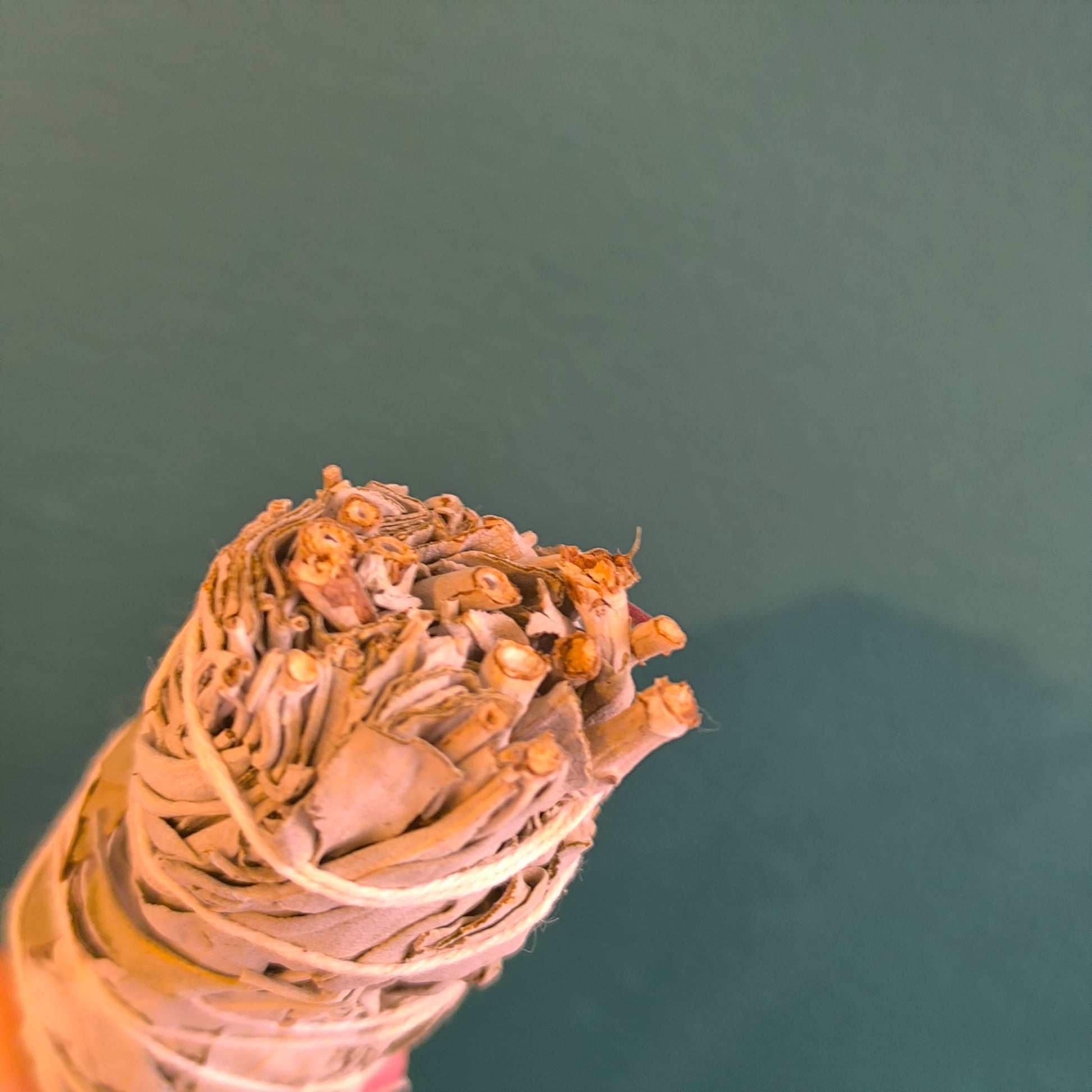Stub or smudge the sage stick out onto a plate or suitable dish to stop the burning and save the rest of the sage wand for another day