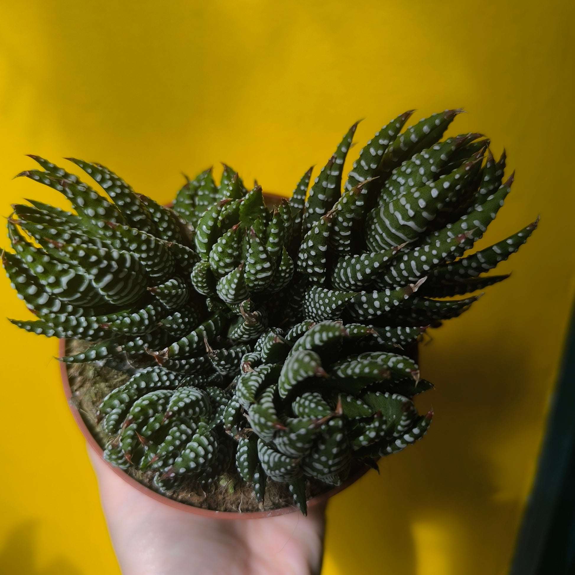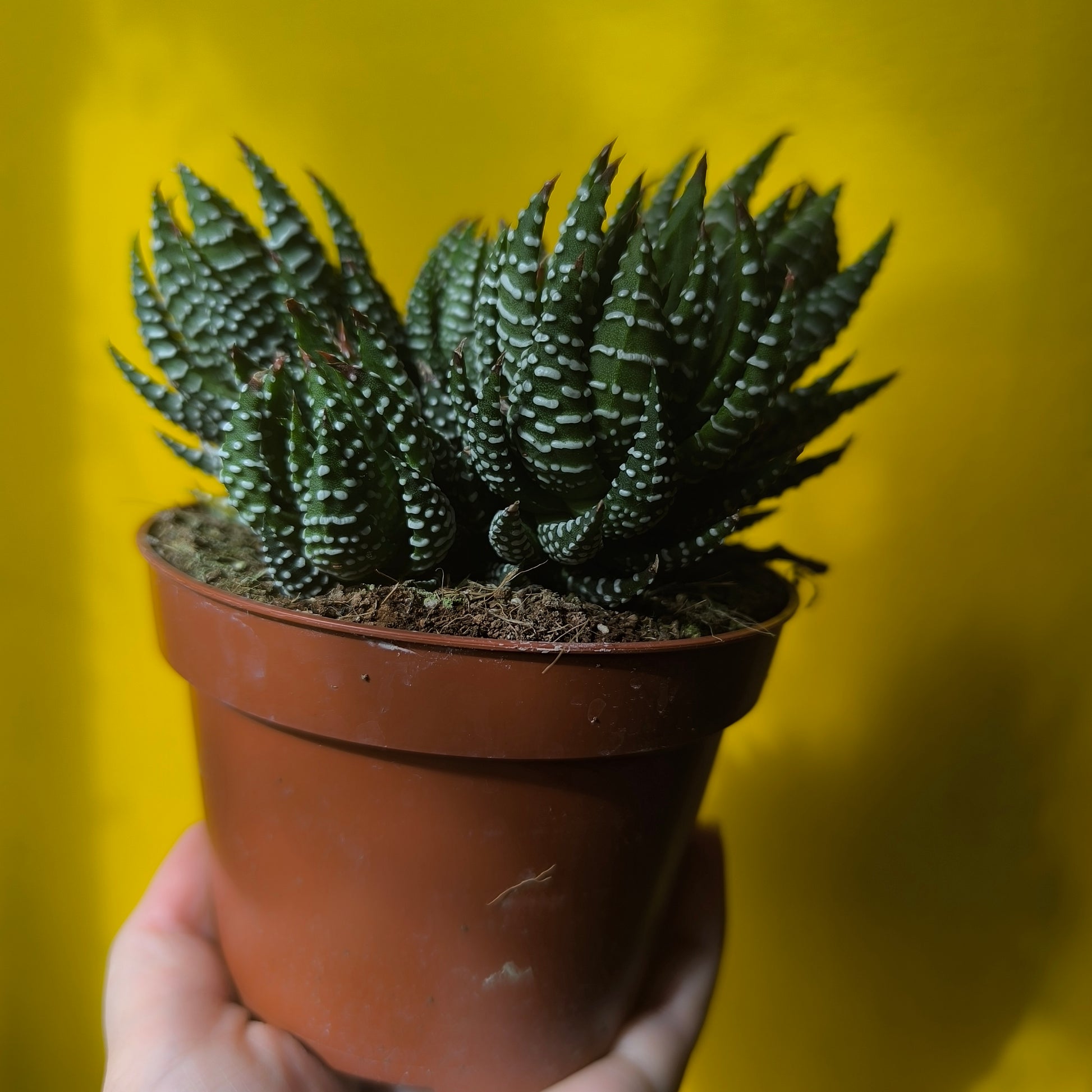 The Zebra Cactus or Haworthia is a stunning succulent prized for its unique, striped appearance. Its cylindrical body is adorned with white bands that contrast beautifully against the dark green skin.