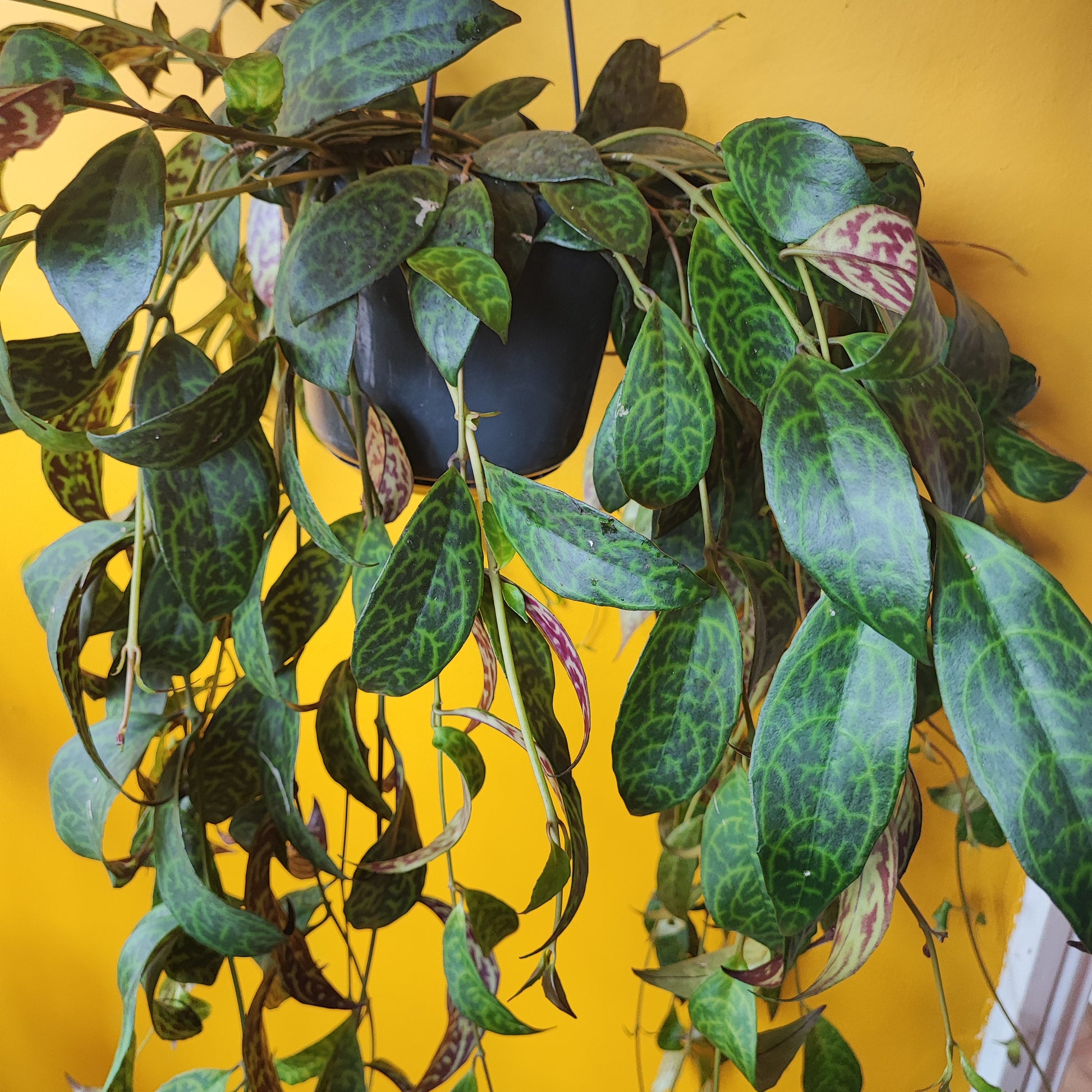 Aeschynanthus marmoratus, or the Zebra Basket Vine houseplant, is a tropical, epiphytic, trailing plant known for its deep green leaves with contrasting marbled patterns of lighter green or silver, and purple-red undersides. It is a creeping plant with long, flexible stems, often grown in hanging baskets to really show-off its foliage. While it can produce tubular, reddish-brown delicate flowers that resemble lipsticks, the foliage is the main ornamental feature and is really very striking